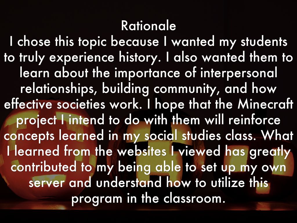 I chose this topic because I wanted my students to truly experience history. I also wanted them to learn about the importance of interpersonal relationships, building community, and how effective societies work. I hope that the Minecraft project I intend to do with them will reinforce concepts learned in my social studies class. What I learned from the websites I viewed has greatly contributed to my being able to set up my own server and understand how to utilize this program in the classroom.