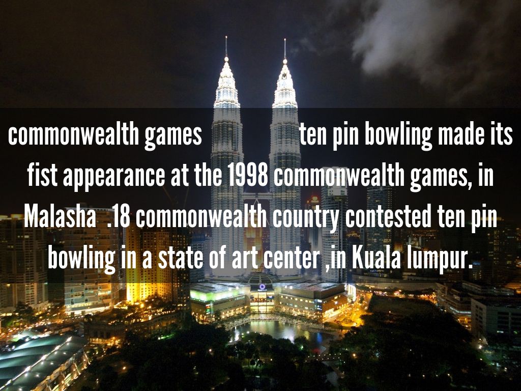 commonwealth games ten pin bowling made its fist appearance at the 1998 commonwealth games, in Malasha .18 commonwealth country contested ten pin bowling in a state of art center ,in Kuala lumpur.