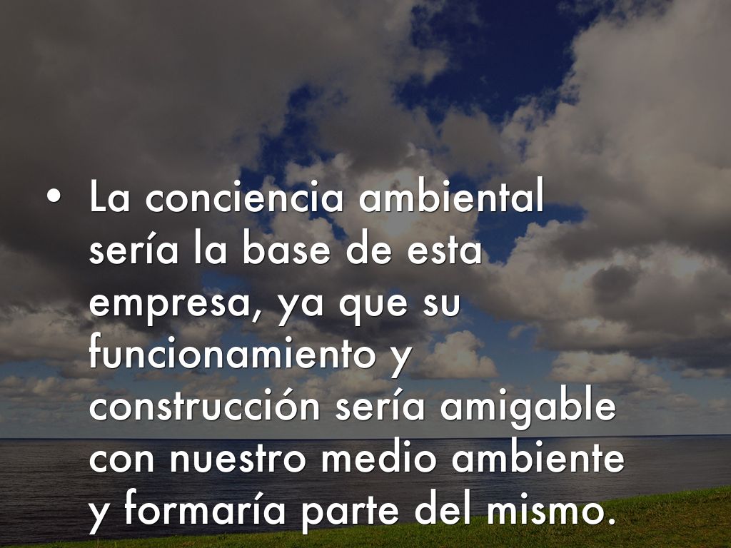 La conciencia ambiental sería la base de esta empresa, ya que su funcionamiento y construcción sería amigable con nuestro medio ambiente y formaría parte del mismo.