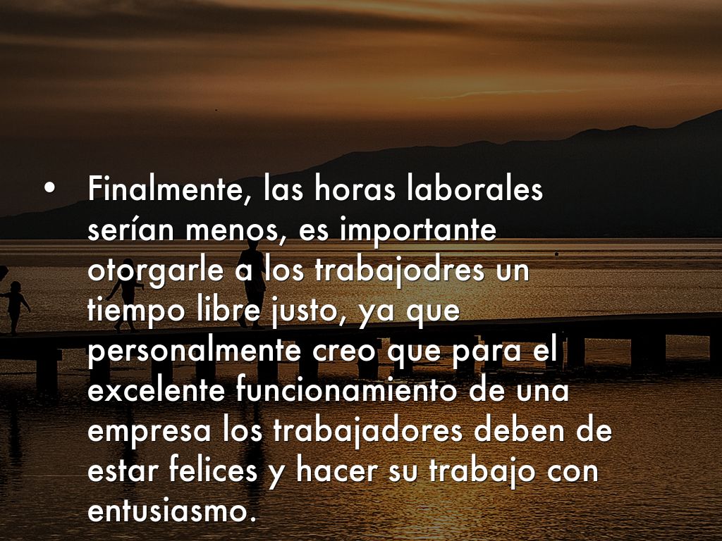 Finalmente, las horas laborales serían menos, es importante otorgarle a los trabajodres un tiempo libre justo, ya que personalmente creo que para el excelente funcionamiento de una empresa los trabajadores deben de estar felices y hacer su trabajo con entusiasmo.