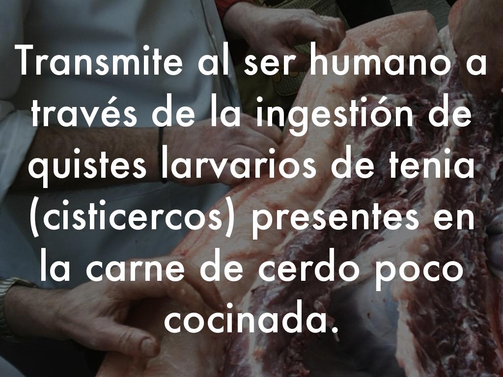 Transmite al ser humano a través de la ingestión de quistes larvarios de tenia (cisticercos) presentes en la carne de cerdo poco cocinada.