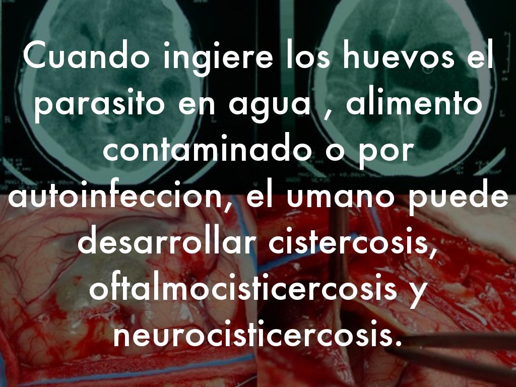 Cuando ingiere los huevos el parasito en agua , alimento contaminado o por autoinfeccion, el umano puede desarrollar cistercosis, oftalmocisticercosis y neurocisticercosis.