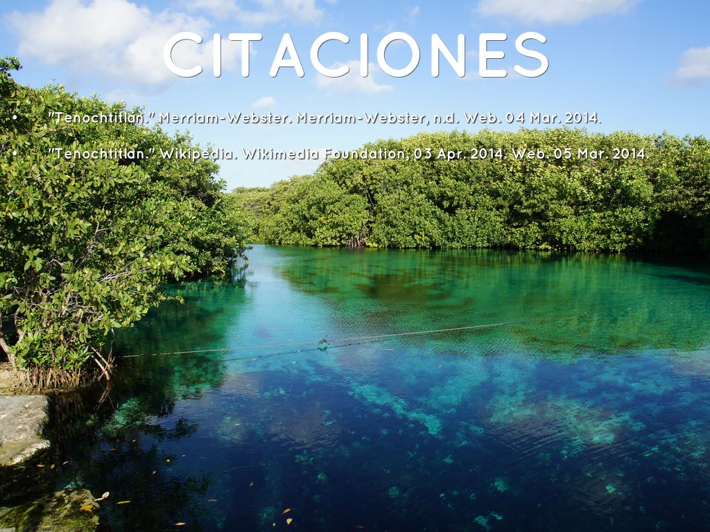• "Tenochtitlán." Merriam-Webster. Merriam-Webster, n.d. Web. 04 Mar. 2014.