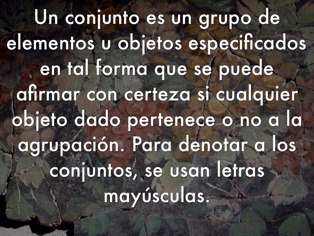 Un conjunto es un grupo de elementos u objetos especificados en tal forma que se puede afirmar con certeza si cualquier objeto dado pertenece o no a la agrupación. Para denotar a los conjuntos, se usan letras mayúsculas.