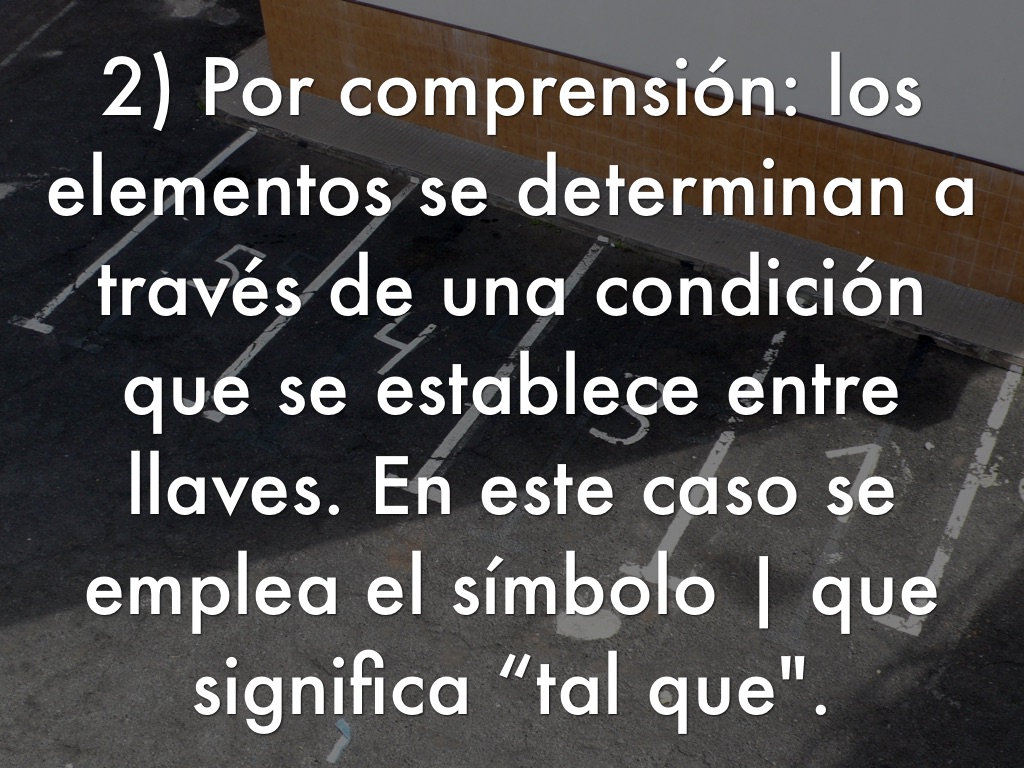 2) Por comprensión: los elementos se determinan a través de una condición que se establece entre llaves. En este caso se emplea el símbolo | que significa “tal que".