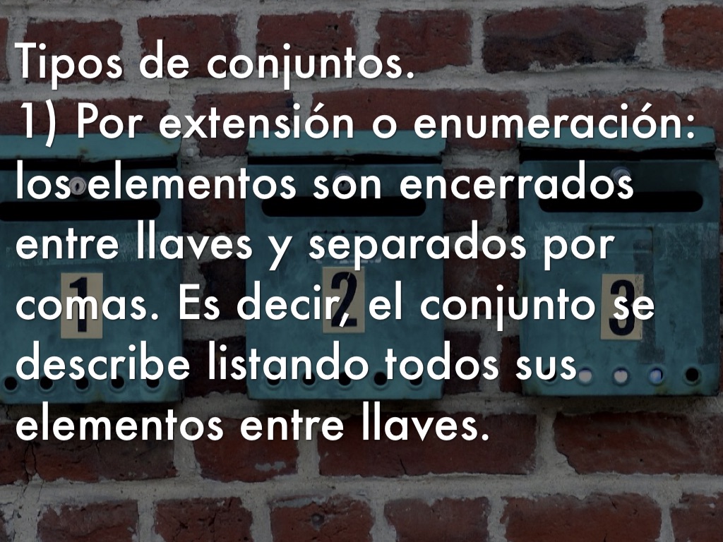Tipos de conjuntos. 1) Por extensión o enumeración: los elementos son encerrados entre llaves y separados por comas. Es decir, el conjunto se describe listando todos sus elementos entre llaves.