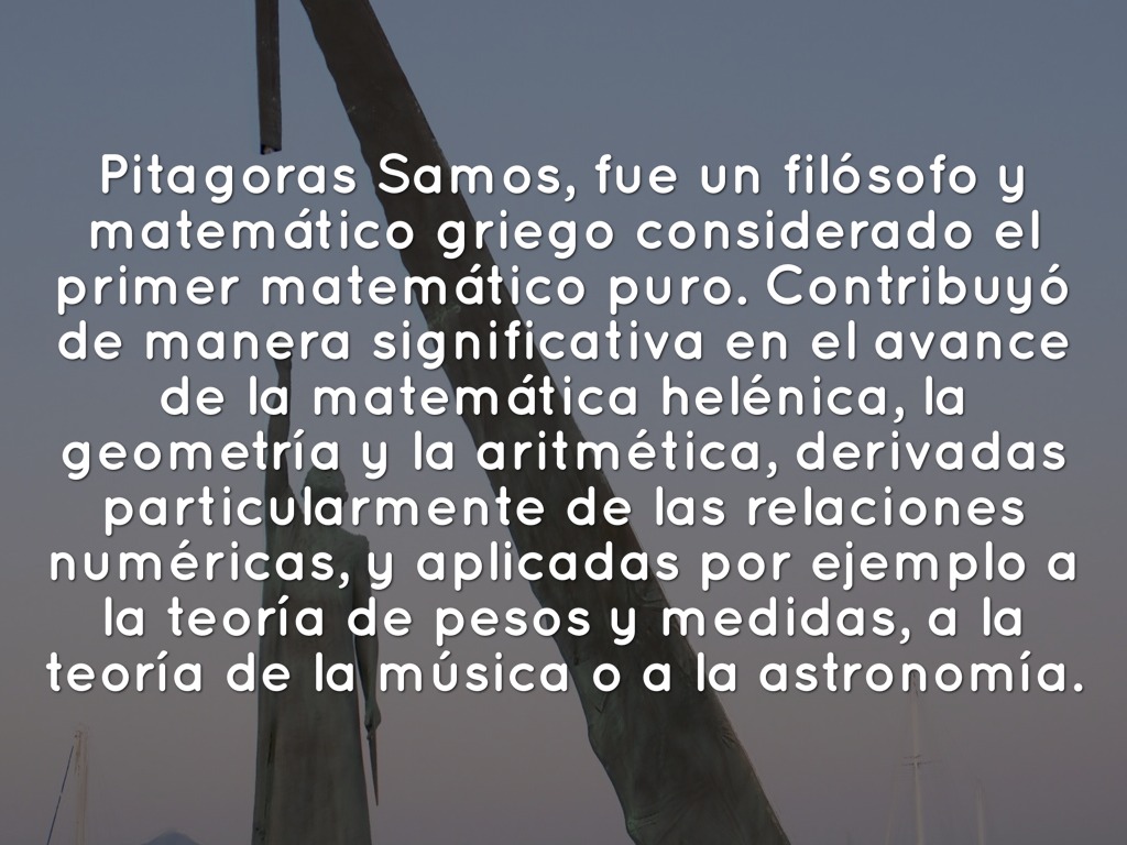Pitagoras Samos, fue un filósofo y matemático griego considerado el primer matemático puro. Contribuyó de manera significativa en el avance de la matemática helénica, la geometría y la aritmética, derivadas particularmente de las relaciones numéricas, y aplicadas por ejemplo a la teoría de pesos y medidas, a la teoría de la música o a la astronomía.