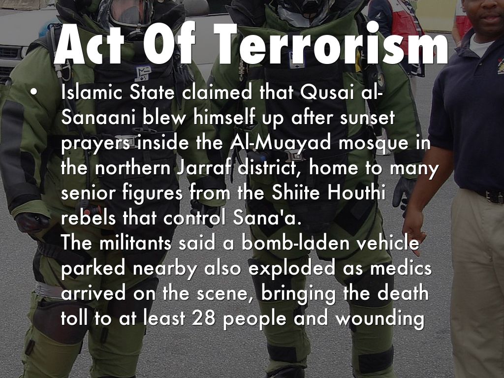 Islamic State claimed that Qusai al-Sanaani blew himself up after sunset prayers inside the Al-Muayad mosque in the northern Jarraf district, home to many senior figures from the Shiite Houthi rebels that control Sana'a.