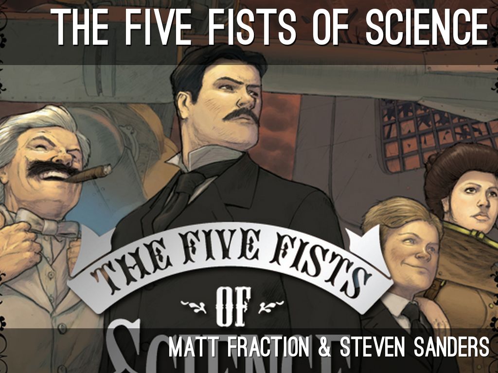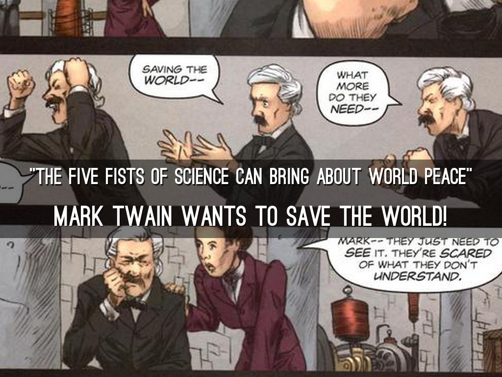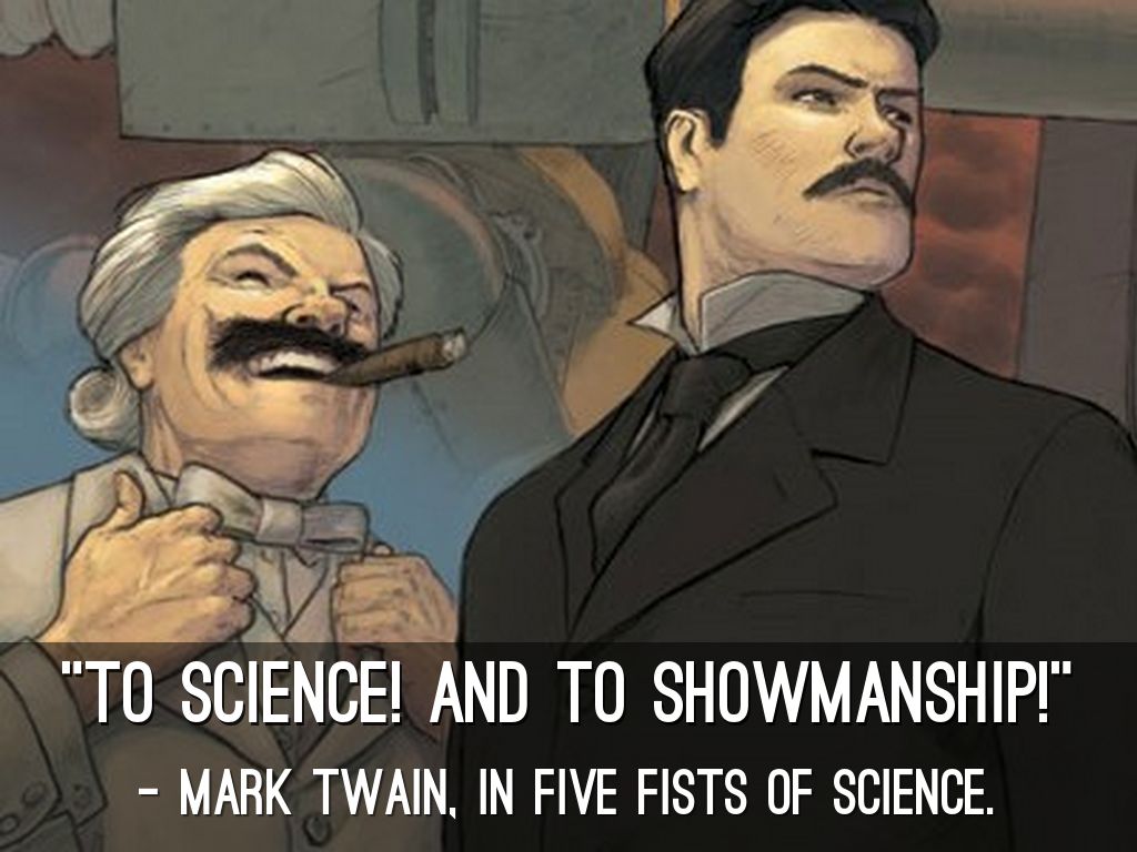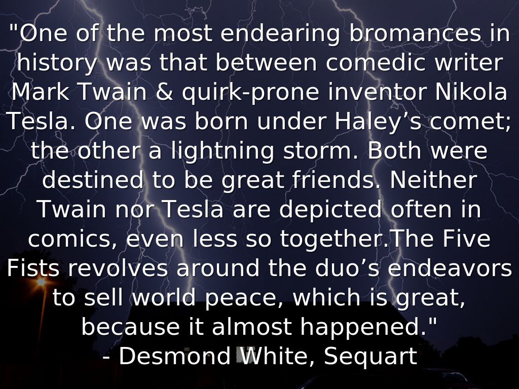 "One of the most endearing bromances in history was that between comedic writer Mark Twain & quirk-prone inventor Nikola Tesla. One was born under Haley’s comet; the other a lightning storm. Both were destined to be great friends. Neither Twain nor Tesla are depicted often in comics, even less so together.The Five Fists revolves around the duo’s endeavors to sell world peace, which is great, because it almost happened."