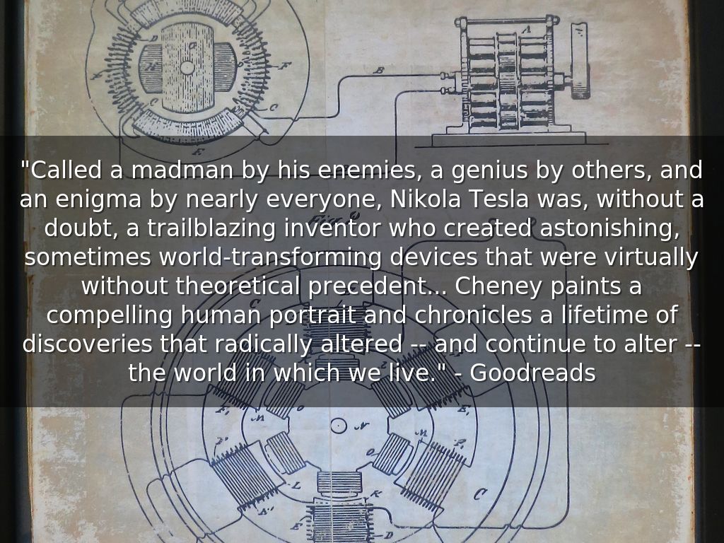 "Called a madman by his enemies, a genius by others, and an enigma by nearly everyone, Nikola Tesla was, without a doubt, a trailblazing inventor who created astonishing, sometimes world-transforming devices that were virtually without theoretical precedent... Cheney paints a compelling human portrait and chronicles a lifetime of discoveries that radically altered -- and continue to alter -- the world in which we live." - Goodreads