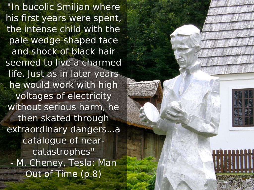 "In bucolic Smiljan where his first years were spent, the intense child with the pale wedge-shaped face and shock of black hair seemed to live a charmed life. Just as in later years he would work with high voltages of electricity without serious harm, he then skated through extraordinary dangers...a catalogue of near-catastrophes"