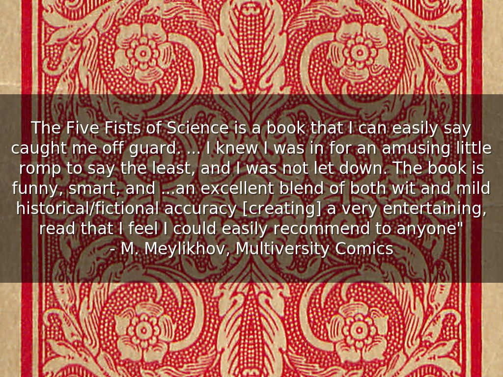 The Five Fists of Science is a book that I can easily say caught me off guard. ... I knew I was in for an amusing little romp to say the least, and I was not let down. The book is funny, smart, and ...an excellent blend of both wit and mild historical/fictional accuracy [creating] a very entertaining, read that I feel I could easily recommend to anyone"