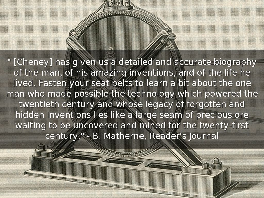 " [Cheney] has given us a detailed and accurate biography of the man, of his amazing inventions, and of the life he lived. Fasten your seat belts to learn a bit about the one man who made possible the technology which powered the twentieth century and whose legacy of forgotten and hidden inventions lies like a large seam of precious ore waiting to be uncovered and mined for the twenty-first century." - B. Matherne, Reader's Journal