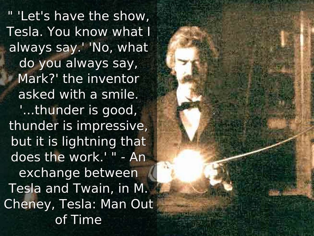 " 'Let's have the show, Tesla. You know what I always say.' 'No, what do you always say, Mark?' the inventor asked with a smile. '...thunder is good, thunder is impressive, but it is lightning that does the work.' " - An exchange between Tesla and Twain, in M. Cheney, Tesla: Man Out of Time