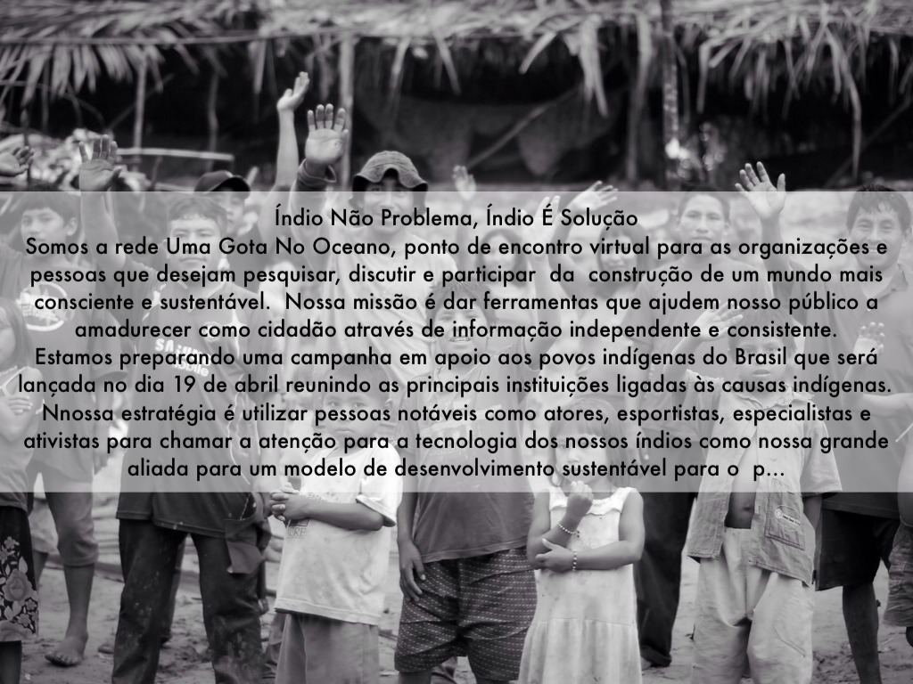 Índio Não Problema, Índio É Solução Somos a rede Uma Gota No Oceano, ponto de encontro virtual para as organizações e pessoas que desejam pesquisar, discutir e participar da construção de um mundo mais consciente e sustentável. Nossa missão é dar ferramentas que ajudem nosso público a amadurecer como cidadão através de informação independente e consistente. Estamos preparando uma campanha em apoio aos povos indígenas do Brasil que será lançada no dia 19 de abril reunindo as principais instituições ligadas às causas indígenas. Nnossa estratégia é utilizar pessoas notáveis como atores, esportistas, especialistas e ativistas para chamar a atenção para a tecnologia dos nossos índios como nossa grande aliada para um modelo de desenvolvimento sustentável para o país. Por reconhecermos a importância da seu trabalho, queremos convidá-la para fazer parte deste movimento social.