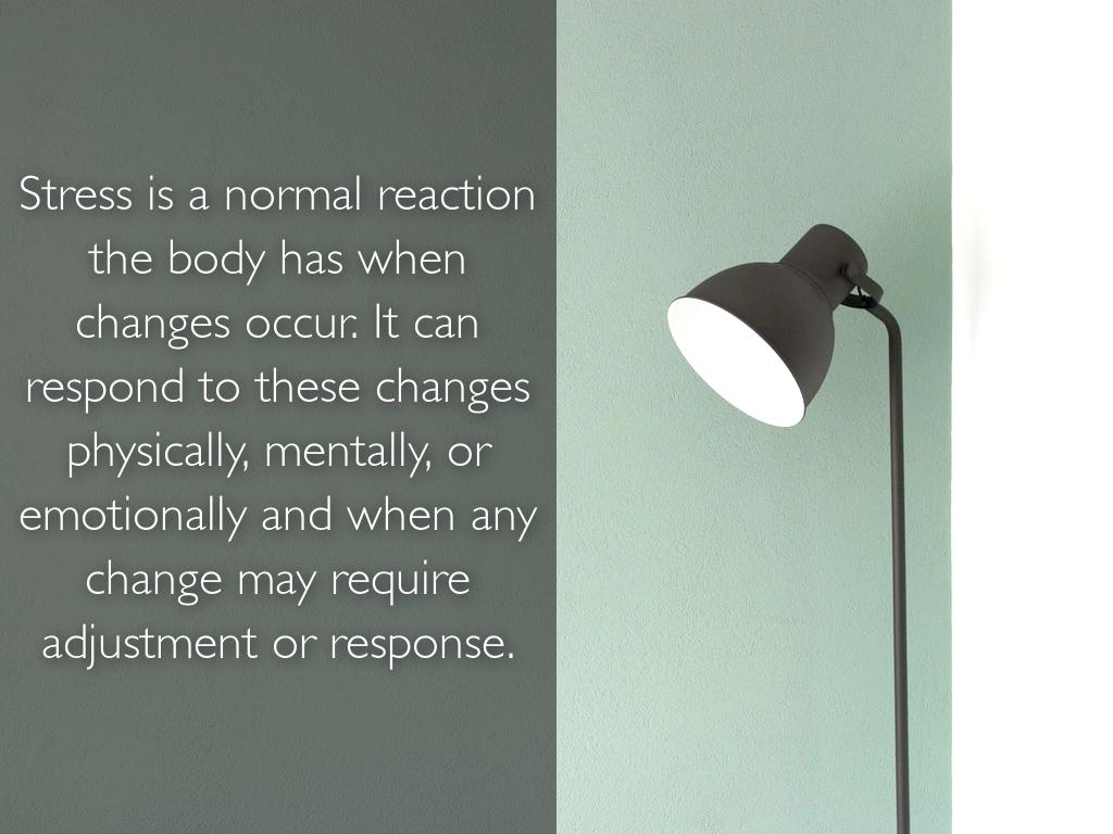 Stress is a normal reaction the body has when changes occur. It can respond to these changes physically, mentally, or emotionally and when any change may require adjustment or response.