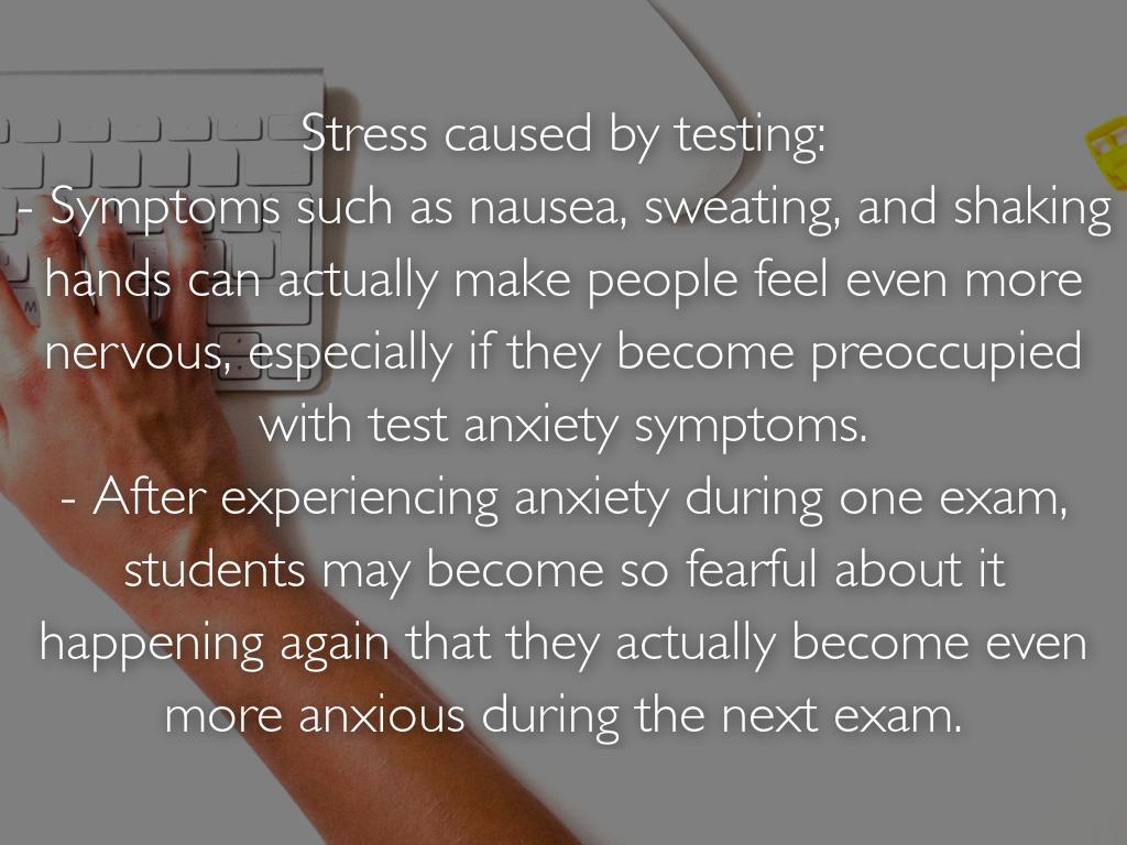 - Symptoms such as nausea, sweating, and shaking hands can actually make people feel even more nervous, especially if they become preoccupied with test anxiety symptoms.