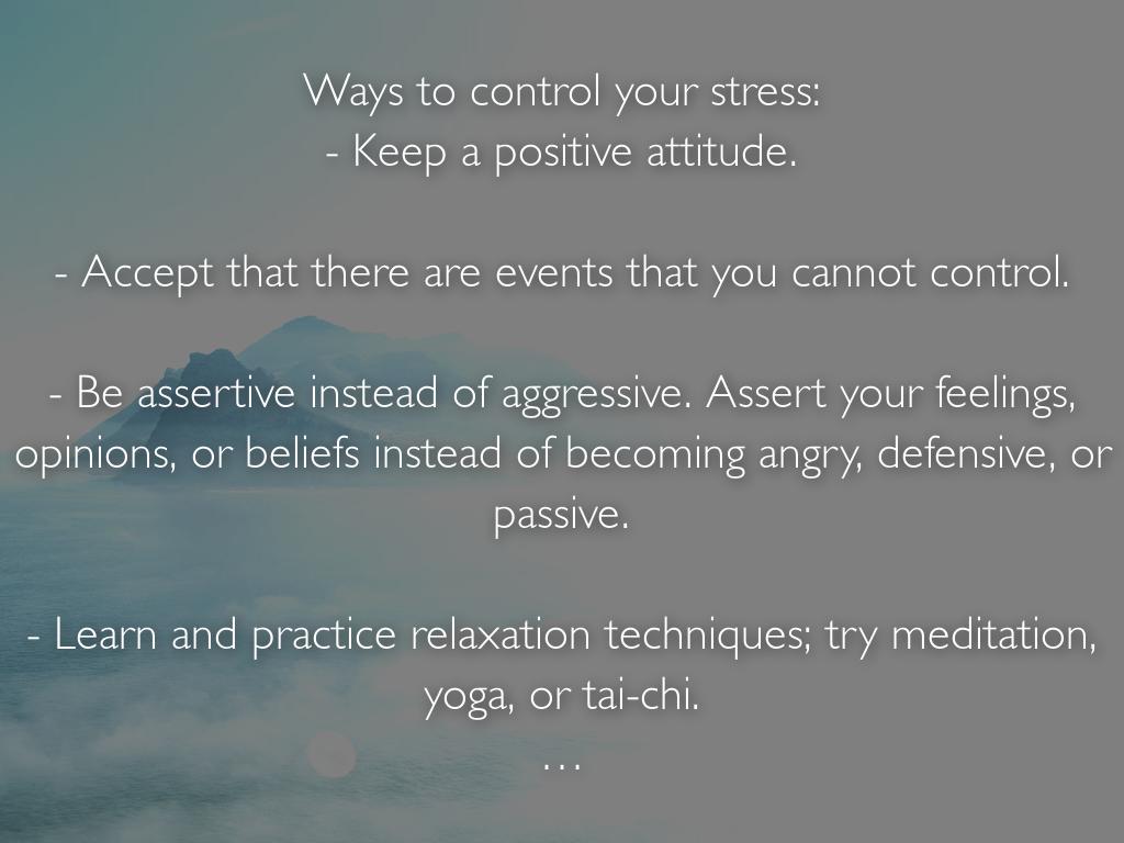 - Learn and practice relaxation techniques; try meditation, yoga, or tai-chi.