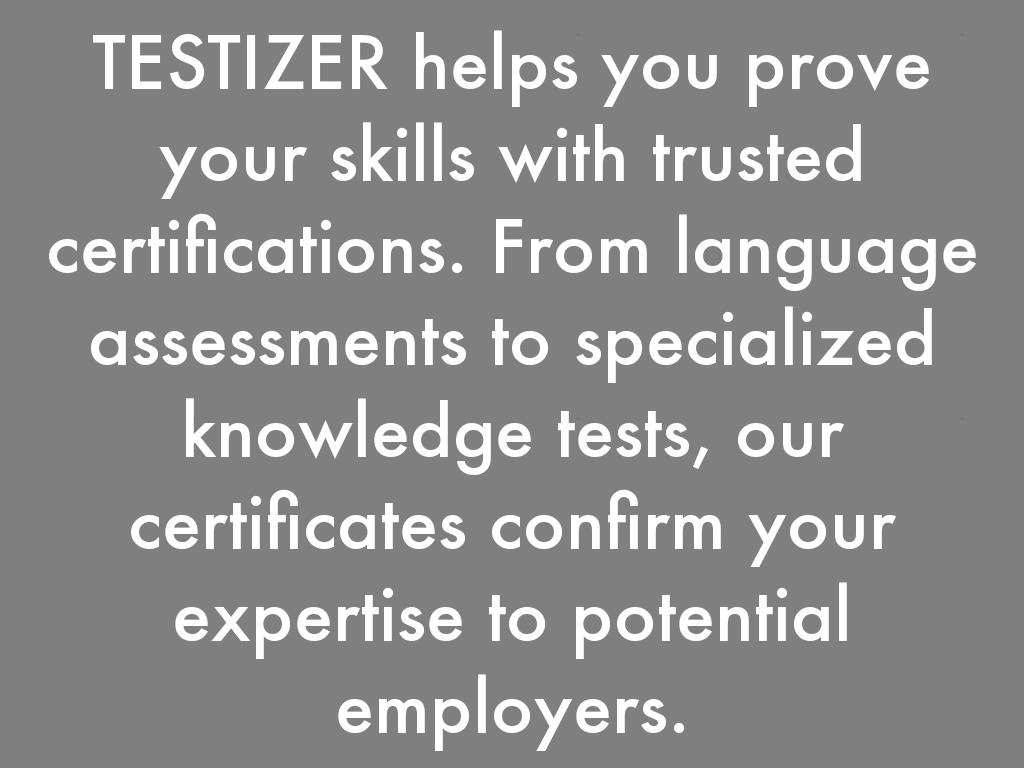 TESTIZER helps you prove your skills with trusted certifications. From language assessments to specialized knowledge tests, our certificates confirm your expertise to potential employers.