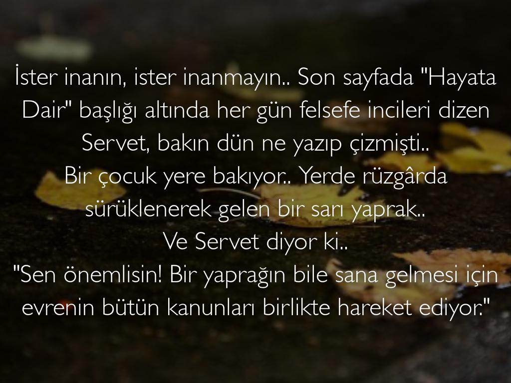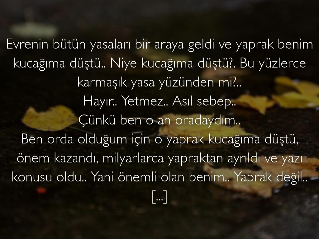 Ben orda olduğum için o yaprak kucağıma düştü, önem kazandı, milyarlarca yapraktan ayrıldı ve yazı konusu oldu.. Yani önemli olan benim.. Yaprak değil..