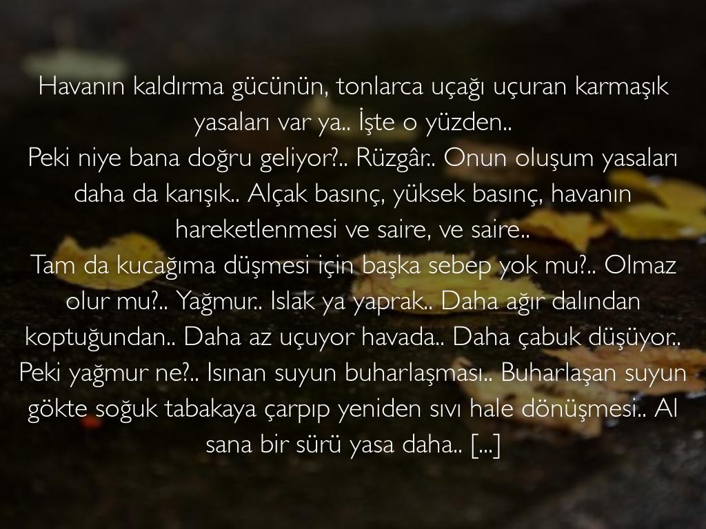 Tam da kucağıma düşmesi için başka sebep yok mu?.. Olmaz olur mu?.. Yağmur.. Islak ya yaprak.. Daha ağır dalından koptuğundan.. Daha az uçuyor havada.. Daha çabuk düşüyor.. Peki yağmur ne?.. Isınan suyun buharlaşması.. Buharlaşan suyun gökte soğuk tabakaya çarpıp yeniden sıvı hale dönüşmesi.. Al sana bir sürü yasa daha.. [...]