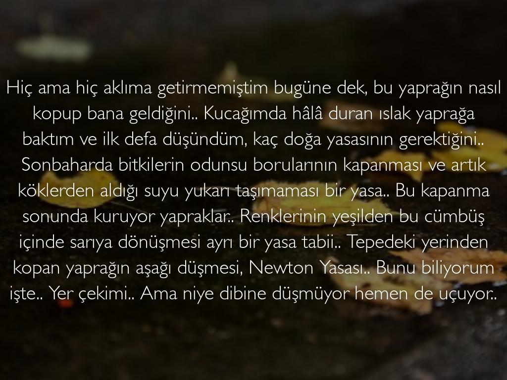 Hiç ama hiç aklıma getirmemiştim bugüne dek, bu yaprağın nasıl kopup bana geldiğini.. Kucağımda hâlâ duran ıslak yaprağa baktım ve ilk defa düşündüm, kaç doğa yasasının gerektiğini..