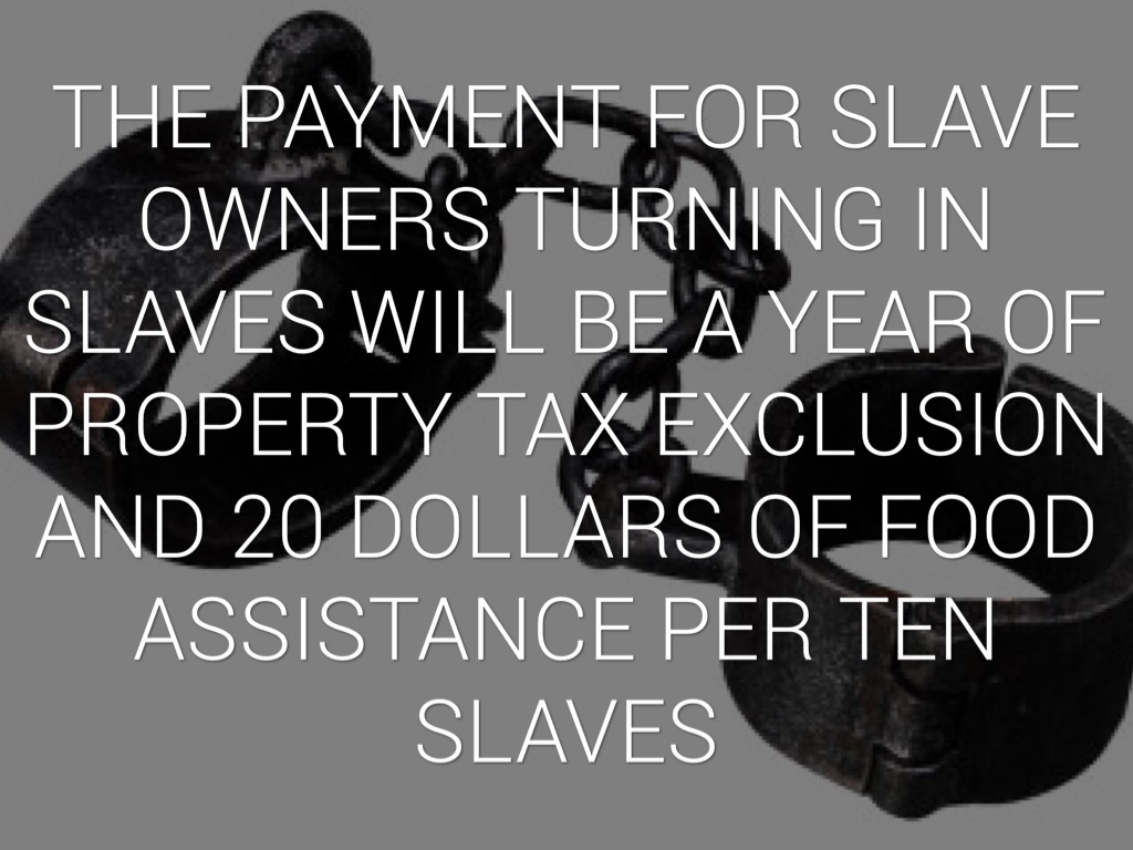THE PAYMENT FOR SLAVE OWNERS TURNING IN SLAVES WILL BE A YEAR OF PROPERTY TAX EXCLUSION AND 20 DOLLARS OF FOOD ASSISTANCE PER TEN SLAVES
