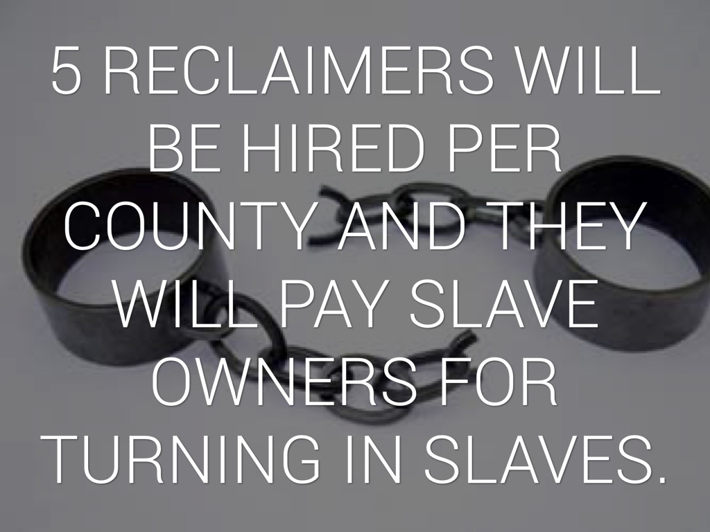 5 RECLAIMERS WILL BE HIRED PER COUNTY AND THEY WILL PAY SLAVE OWNERS FOR TURNING IN SLAVES.