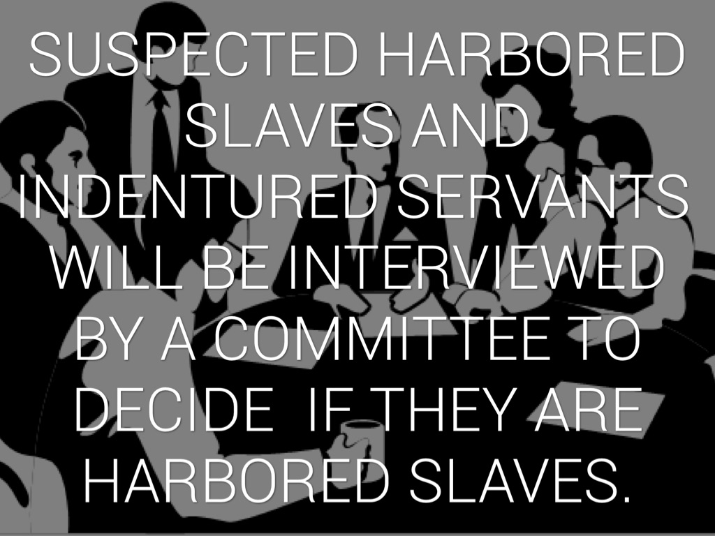SUSPECTED HARBORED SLAVES AND INDENTURED SERVANTS WILL BE INTERVIEWED BY A COMMITTEE TO DECIDE IF THEY ARE HARBORED SLAVES.
