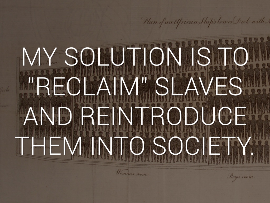 MY SOLUTION IS TO "RECLAIM" SLAVES AND REINTRODUCE THEM INTO SOCIETY.
