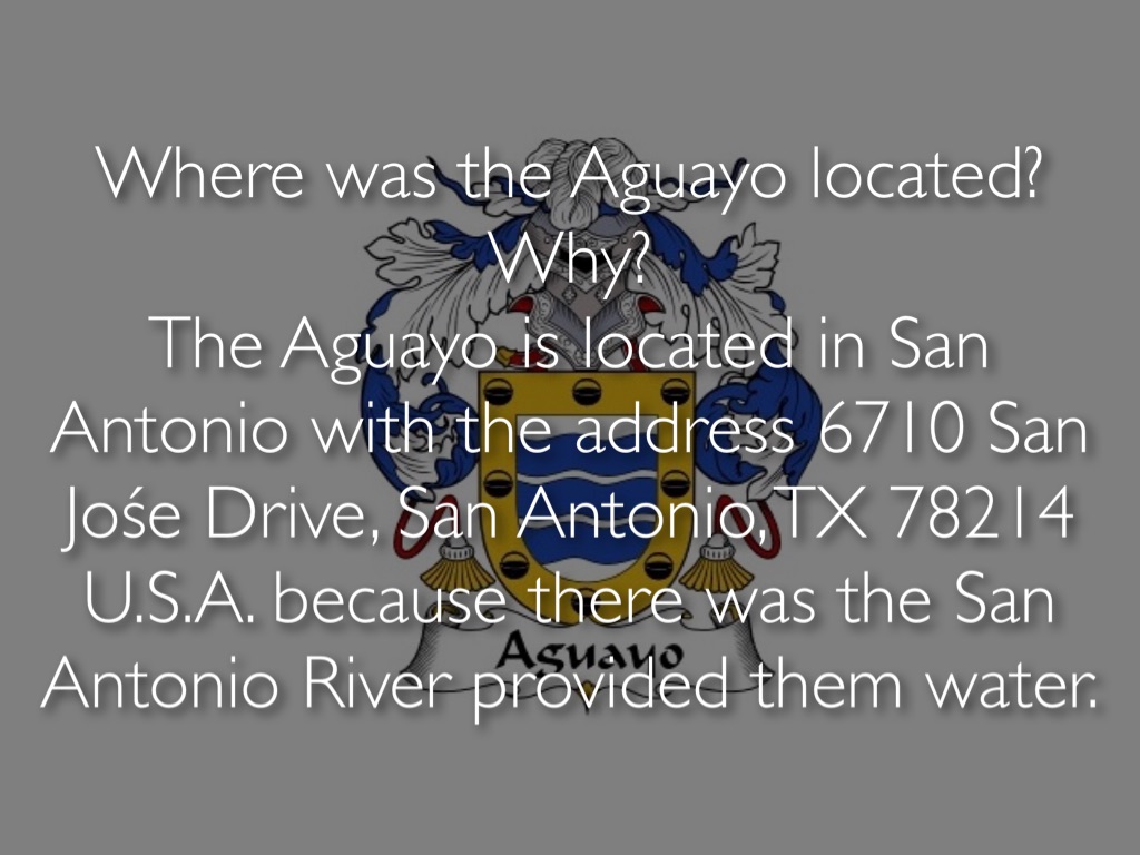 The Aguayo is located in San Antonio with the address 6710 San Jośe Drive, San Antonio, TX 78214 U.S.A. because there was the San Antonio River provided them water.