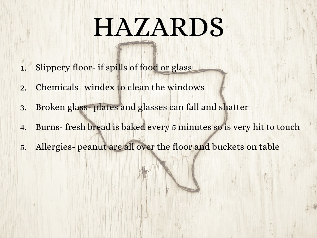• Burns- fresh bread is baked every 5 minutes so is very hit to touch