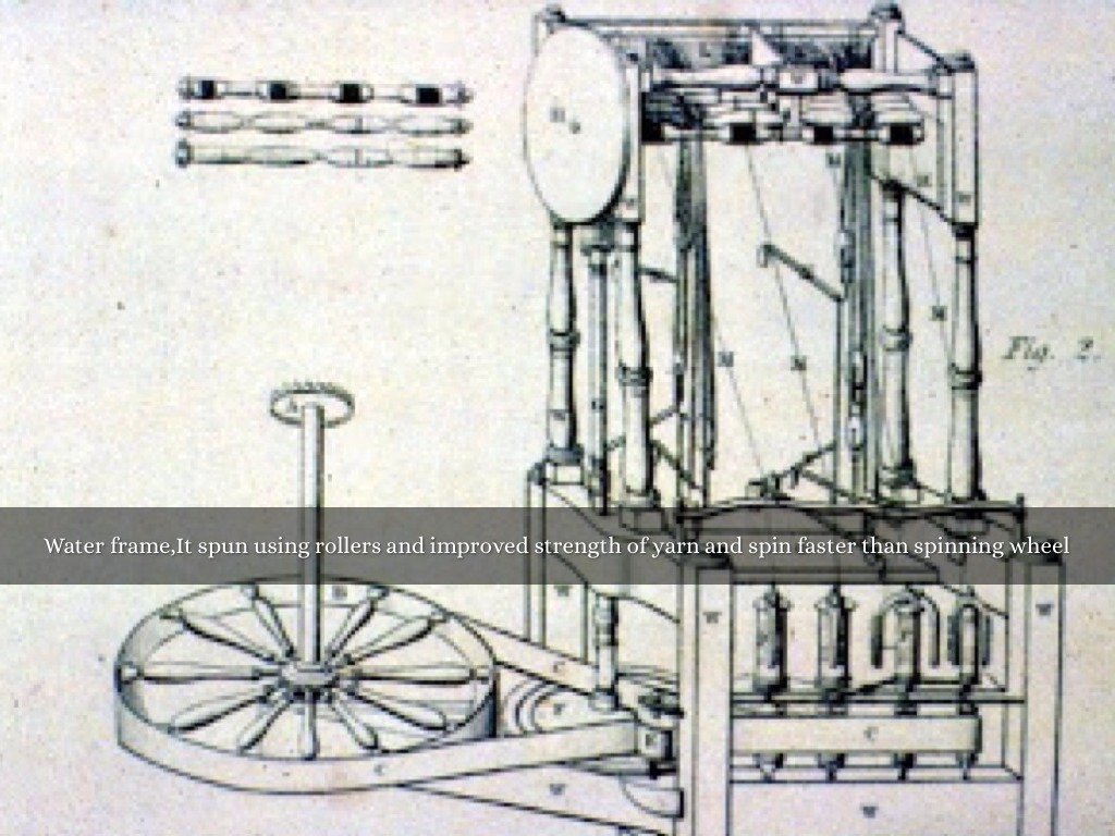 Water frame,It spun using rollers and improved strength of yarn and spin faster than spinning wheel