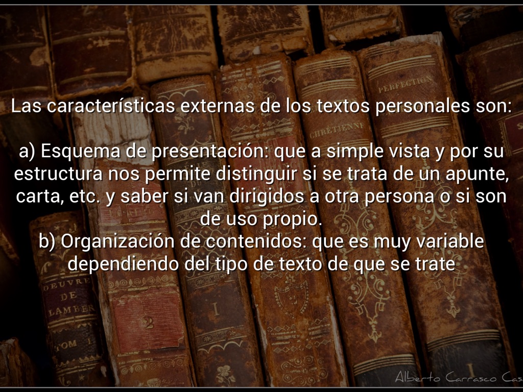 estructura nos permite distinguir si se trata de un apunte, carta, etc. y saber si van dirigidos a otra persona o si son de uso propio. b) Organización de contenidos: que es muy variable dependiendo del tipo de texto de que se trate