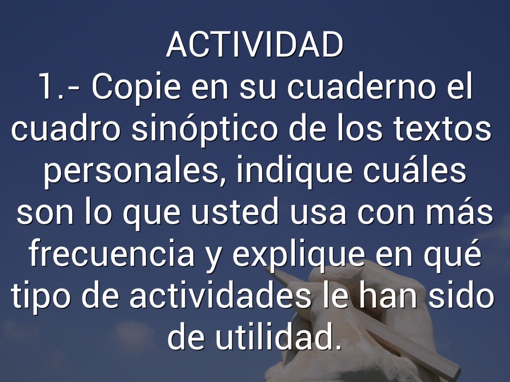 1.- Copie en su cuaderno el cuadro sinóptico de los textos personales, indique cuáles son lo que usted usa con más frecuencia y explique en qué tipo de actividades le han sido de utilidad.