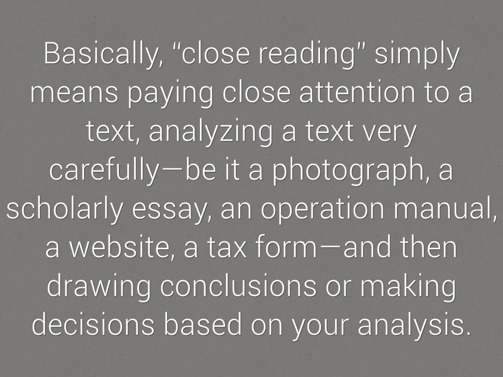 Basically, “close reading” simply means paying close attention to a text, analyzing a text very carefully—be it a photograph, a scholarly essay, an operation manual, a website, a tax form—and then drawing conclusions or making decisions based on your analysis.