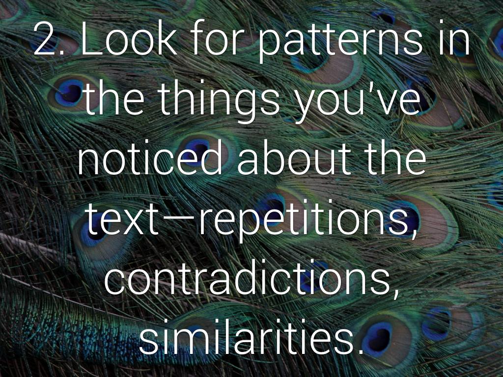 2. Look for patterns in the things you've noticed about the text—repetitions, contradictions, similarities.