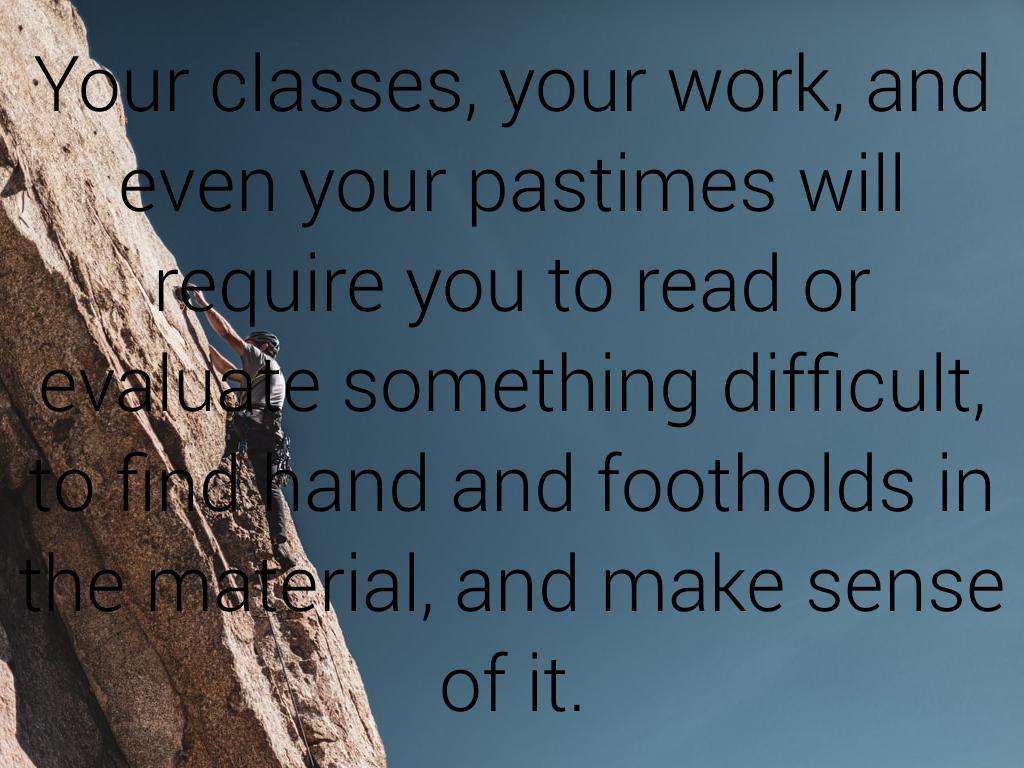 Your classes, your work, and even your pastimes will require you to read or evaluate something difficult, to find hand and footholds in the material, and make sense of it.