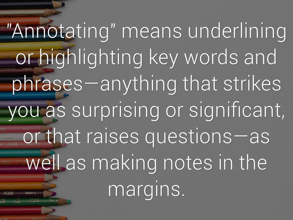 "Annotating" means underlining or highlighting key words and phrases—anything that strikes you as surprising or significant, or that raises questions—as well as making notes in the margins.