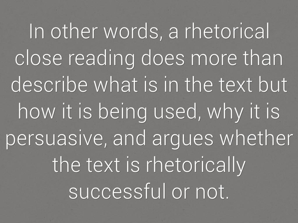 In other words, a rhetorical close reading does more than describe what is in the text but how it is being used, why it is persuasive, and argues whether the text is rhetorically successful or not.