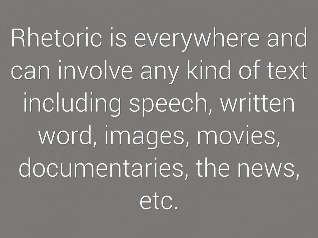 Rhetoric is everywhere and can involve any kind of text including speech, written word, images, movies, documentaries, the news, etc.