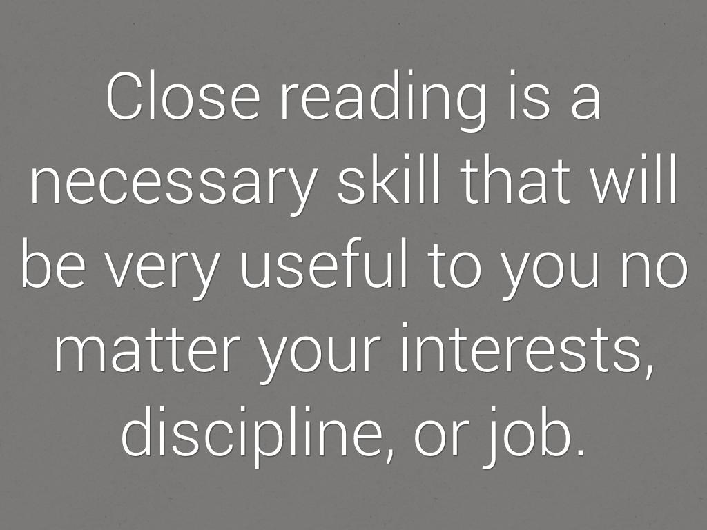 Close reading is a necessary skill that will be very useful to you no matter your interests, discipline, or job.
