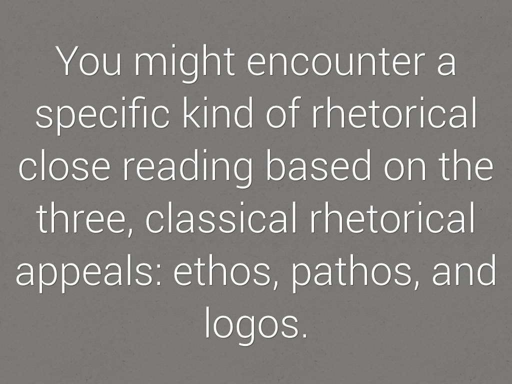 You might encounter a specific kind of rhetorical close reading based on the three, classical rhetorical appeals: ethos, pathos, and logos.