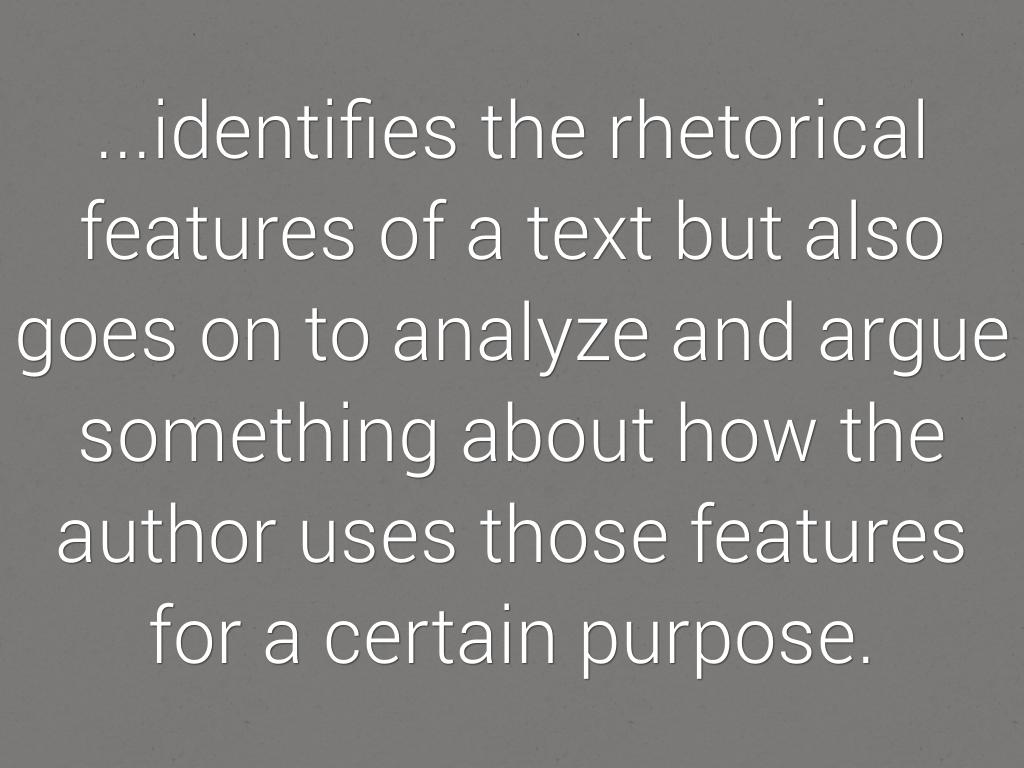 ...identifies the rhetorical features of a text but also goes on to analyze and argue something about how the author uses those features for a certain purpose.