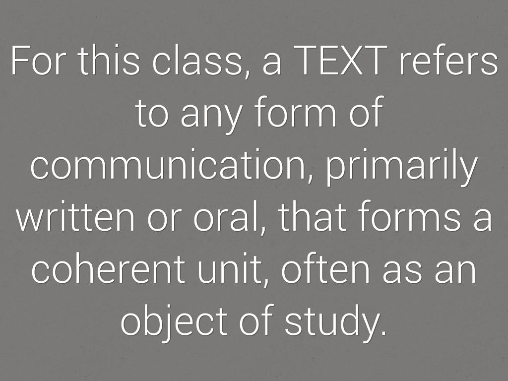 For this class, a TEXT refers to any form of communication, primarily written or oral, that forms a coherent unit, often as an object of study.