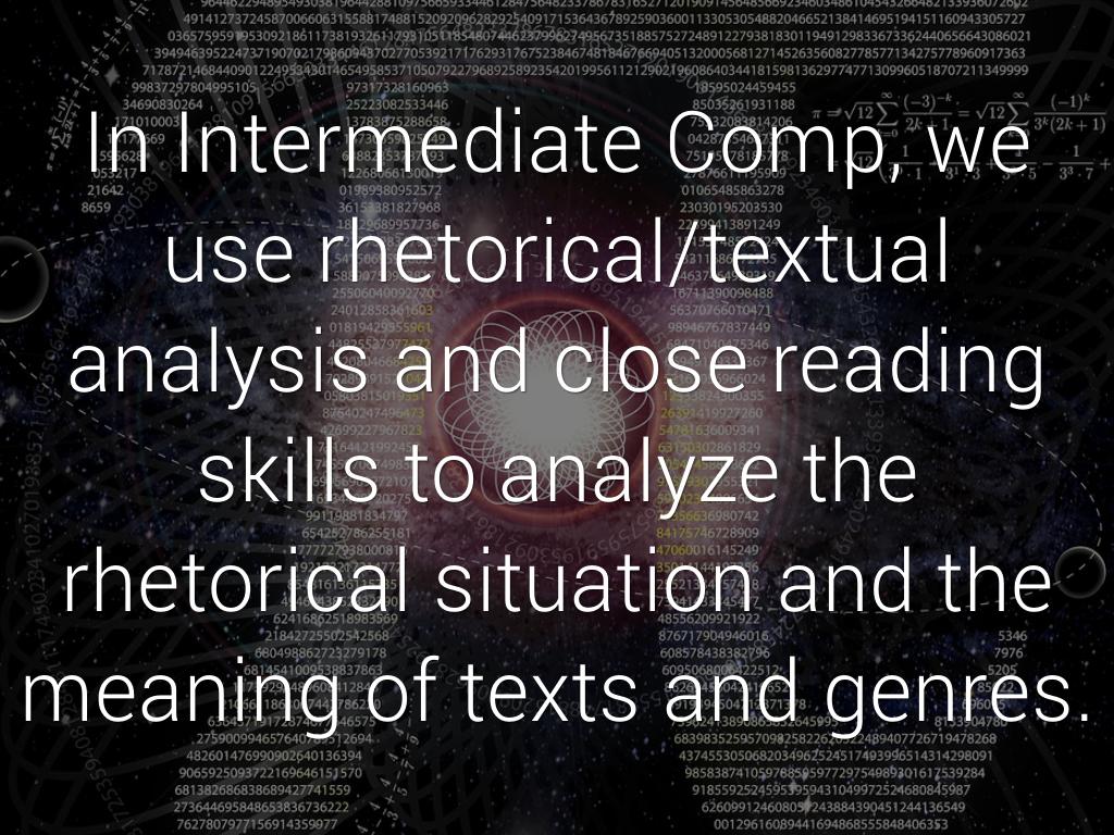 In Intermediate Comp, we use rhetorical/textual analysis and close reading skills to analyze the rhetorical situation and the meaning of texts and genres.
