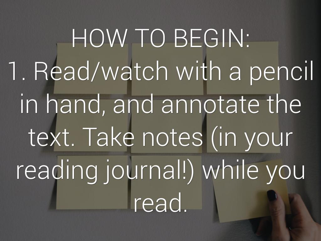 1. Read/watch with a pencil in hand, and annotate the text. Take notes (in your reading journal!) while you read.
