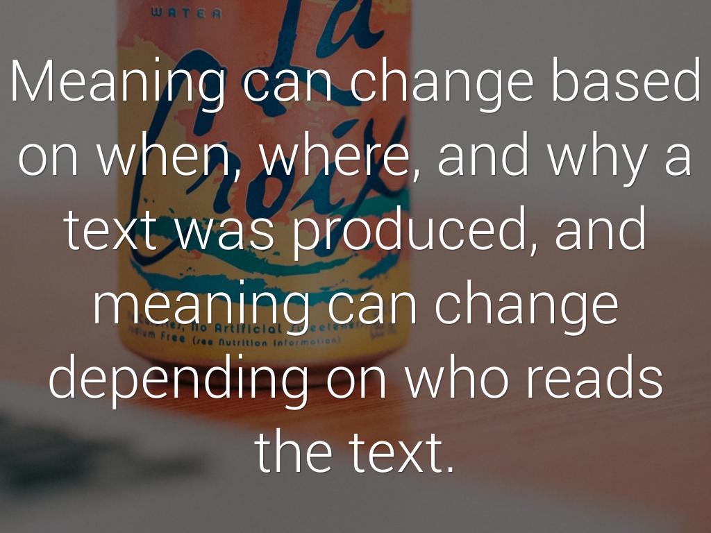 Meaning can change based on when, where, and why a text was produced, and meaning can change depending on who reads the text.