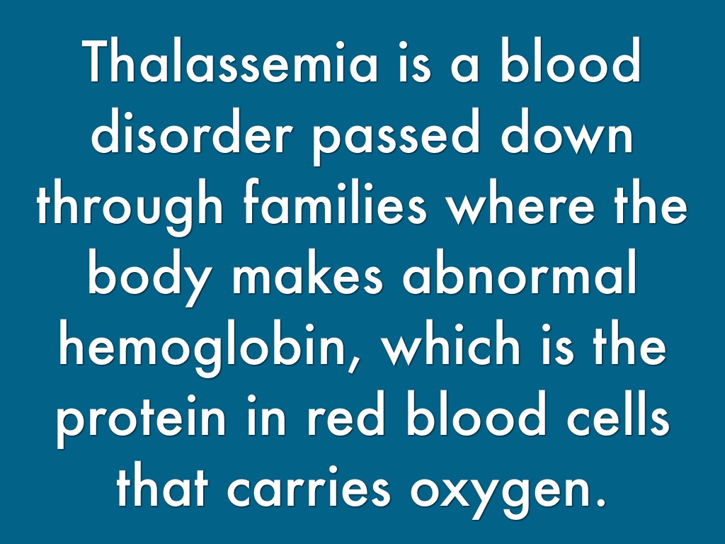 Thalassemia is a blood disorder passed down through families where the body makes abnormal hemoglobin, which is the protein in red blood cells that carries oxygen.