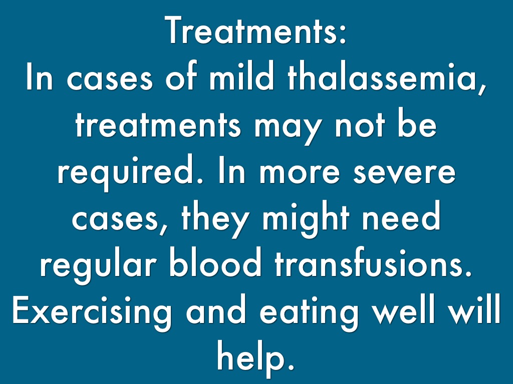 In cases of mild thalassemia, treatments may not be required. In more severe cases, they might need regular blood transfusions. Exercising and eating well will help.